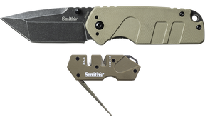 The combo includes the Campaign 2.78" tonto blade features a black stonewash finish that provides extra protection while providing a rugged look. The razor sharp blade is made of precision heat treated 400 series stainless steel with an ambidextrous thumb screw for easy opening. Equipped with rugged custom G10 handles and sturdy liner lock design secures the blade open during use. The Campaign includes a reversible pocket clip. Also included is the Smith’s “Pocket Pal” Tactical Mini Sharpener features G-10 handle with a 420 stainless steel frame, pre-set crossed carbides and ceramic stones, which provide the “Perfect Edge” every time. Carbides provide quick edge setting, and the specially shaped ceramic stones are designed to give you a razor sharp edge on either standard or serrated edges. A fold out, tapered round, diamond coated rod is designed for sharpening serrations and small gut hooks. Unit is compact, lightweight, durable, and comes with a lanyard hole.